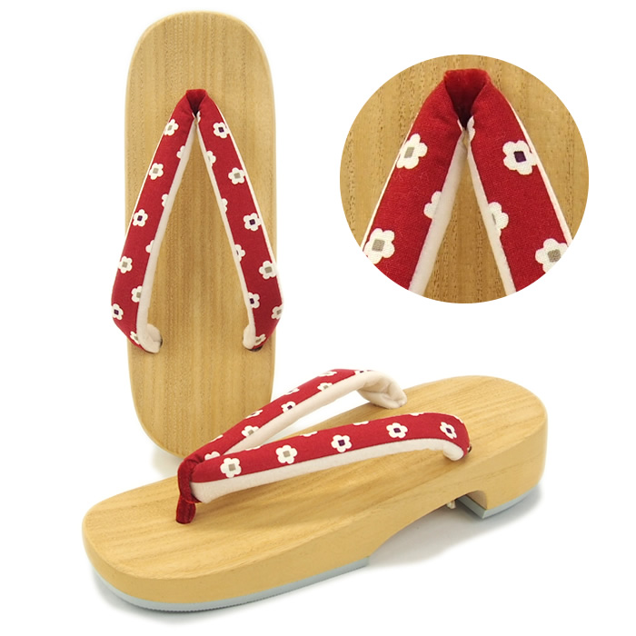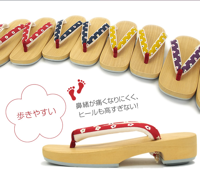 商品コード:dw02fmod01 適応足サイズ:23.5-24.5cm 寸法=S:22.5-8.0-2.5-4.5(cm) M:23.5-8.0-3.0-4.5(cm) L:24.5-8.0-3.0-4.5(cm) 下駄台:白木ヒュース 鼻緒:赤・黄・紺・紫