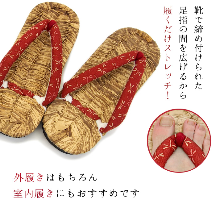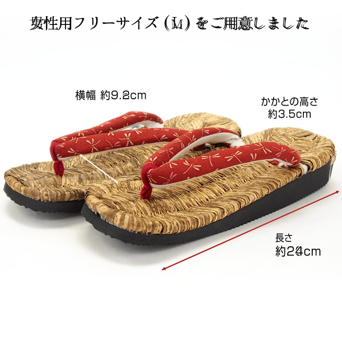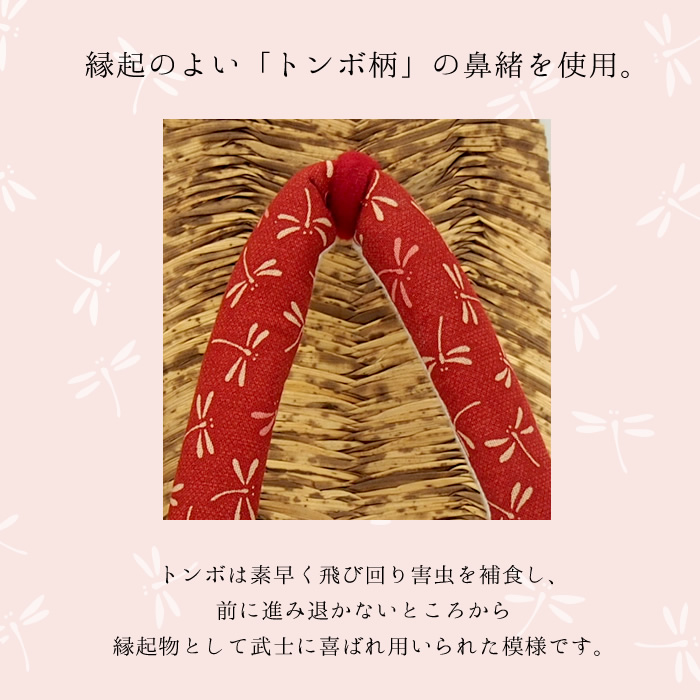 鼻緒カラー:トンボ柄 赤 商品コード:takesan_tonboaka サイズ:女性フリー 寸法=サイズ:縦24.0センチ 横8.5センチ ※こちらの商品は鼻緒の調節ができません。はじめのうちは鼻緒が少しきつく感じるように作られています。履き始めて3日目ぐらいから鼻緒がお客様の足にフィットしてきます。長く履かれていると履かれる方の足に鼻緒が馴染んできます。